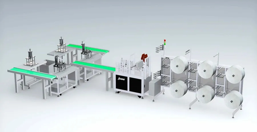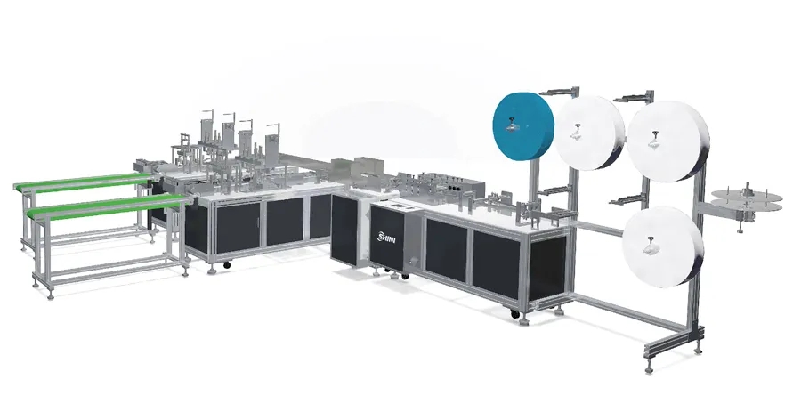 鑒于新型冠狀肺炎疫情在全球的大范圍持續(xù)傳播,為防疫物資的生產(chǎn)帶來了極大的挑戰(zhàn),其中最基本的防護(hù)用品口罩的需求成幾何倍數(shù)的增加。做為一家行業(yè)內(nèi)全球知名的設(shè)備生產(chǎn)商,信易自動(dòng)化事業(yè)處快速反應(yīng),繼推出SMKS全自動(dòng)一拖二平面口罩機(jī)后,全新推出N95/KN95口罩生產(chǎn)設(shè)備,主要用于N95/KN95口罩成型,整卷布料放卷后經(jīng)過滾輪驅(qū)動(dòng)上料,布料通過自動(dòng)上料,鼻梁條整卷牽引開卷,定長(zhǎng)裁切后導(dǎo)入至包邊布料中??谡滞庑瓮ㄟ^超聲模具滾焊,焊接封邊,經(jīng)滾切刀裁切成型,通過滾筒將成型的口罩進(jìn)行輸出,再由人工用超聲波焊接耳帶,最后對(duì)口罩進(jìn)行封邊,標(biāo)準(zhǔn)整套設(shè)備:打片機(jī)x1+封邊機(jī)x2+耳帶機(jī)x2。