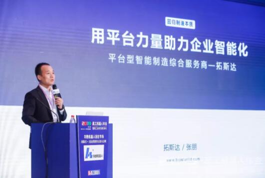 ????????拓斯達機器人事業(yè)部總經理——張朋發(fā)表了“用平臺力量助力企業(yè)智能化”的主題分享。拓斯達將提供適合當下企業(yè)智能改造實施的最佳路徑,將以企業(yè)需求為核心,提供助力制造產業(yè)為對象的整體方案,建立以硬件+服務+數據為底層的結構化平臺,對企業(yè)智能化升級進行深度解構。