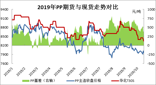 ????????下半年PP市場繼續(xù)震蕩下行,中美貿易緩和出現反復,暫無實質性利好,PP價格仍歸于基本面而繼續(xù)震蕩下行。第三季度,延續(xù)供需寬松的基本面情況,石化庫存維持高位,去庫緩慢,9月份的中美貿易緩和,注入強心劑,PP期貨展開一波反彈,這一階段主要影響因素有:下游開工率文中略下滑且下游維持低庫存拿貨謹慎、石化庫存高企,9月中旬沙特兩油田遇襲、兩桶油庫存下降和十一節(jié)前備貨;第四季度,十一節(jié)后石化累庫較大,壓力加劇,“兩桶油”通過調低價格去庫,去庫壓力暫時性有所緩解,之后去庫緩慢且有反復,而下游開工逐步提升不敵宏觀數據低迷經濟下行壓力較大,汽車行業(yè)持續(xù)加劇低迷,PP期貨價格一路震蕩下行。