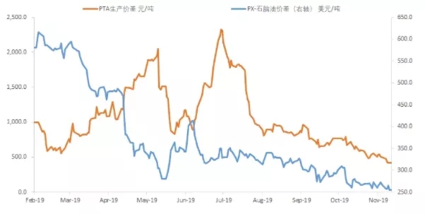 ????????整個(gè)產(chǎn)業(yè)上游都在擴(kuò)張,而終端的需求一直不景氣,這種情形下,依靠變化莫測(cè)的原油市場(chǎng)和個(gè)別裝置檢修一兩周對(duì)市場(chǎng)預(yù)期也不會(huì)有太大的影響。而目前進(jìn)入2019年年尾,今年P(guān)TA價(jià)格不斷創(chuàng)出新低。PTA價(jià)格重心下移的原因十分明顯,主要是大量PTA新裝置、尤其是大煉化配套PX新裝置年內(nèi)持續(xù)投產(chǎn)。