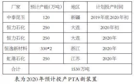 ????????4、恒力石化一套250萬噸PTA裝置計(jì)劃2019年年底投產(chǎn)