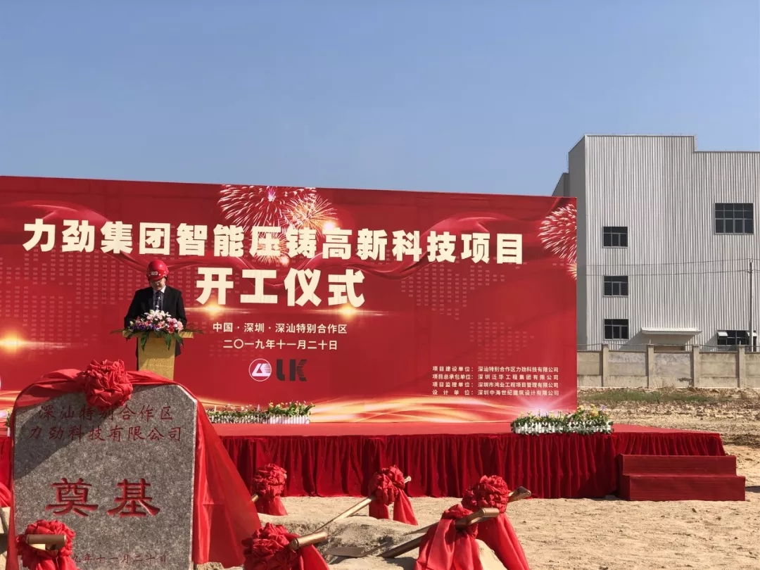 ????????11月20日,位于深汕特別合作區(qū)的力勁集團(tuán)智能壓鑄高新科技項目正式啟動,開工奠基儀式在今天舉行。力勁集團(tuán)創(chuàng)始人劉相尚先生、CEO劉卓銘先生、力勁集團(tuán)深圳領(lǐng)威科技有限公司總經(jīng)理潘玲玲女士、華南市場部總監(jiān)鄧毅明先生及項目總承包單位相關(guān)負(fù)責(zé)人等參加。