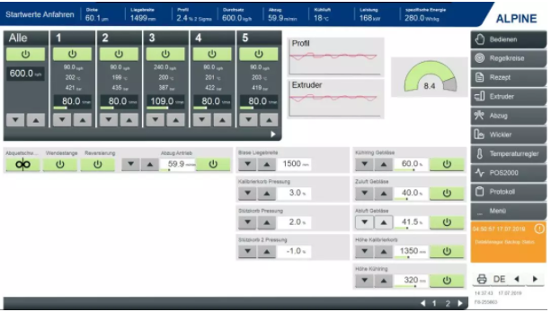 ????????除了擠出控制之外,Syncro還為希望實現(xiàn)整個生產(chǎn)線的單點控制的吹膜制造商開發(fā)了Syntrol? 監(jiān)控系統(tǒng),該系統(tǒng)可以通過一個觸摸屏顯示和同步多個生產(chǎn)線控制。這些控制包括對擠出機的溫度和壓力、空氣環(huán)、IBC、厚度計、籠和牽引的控制。