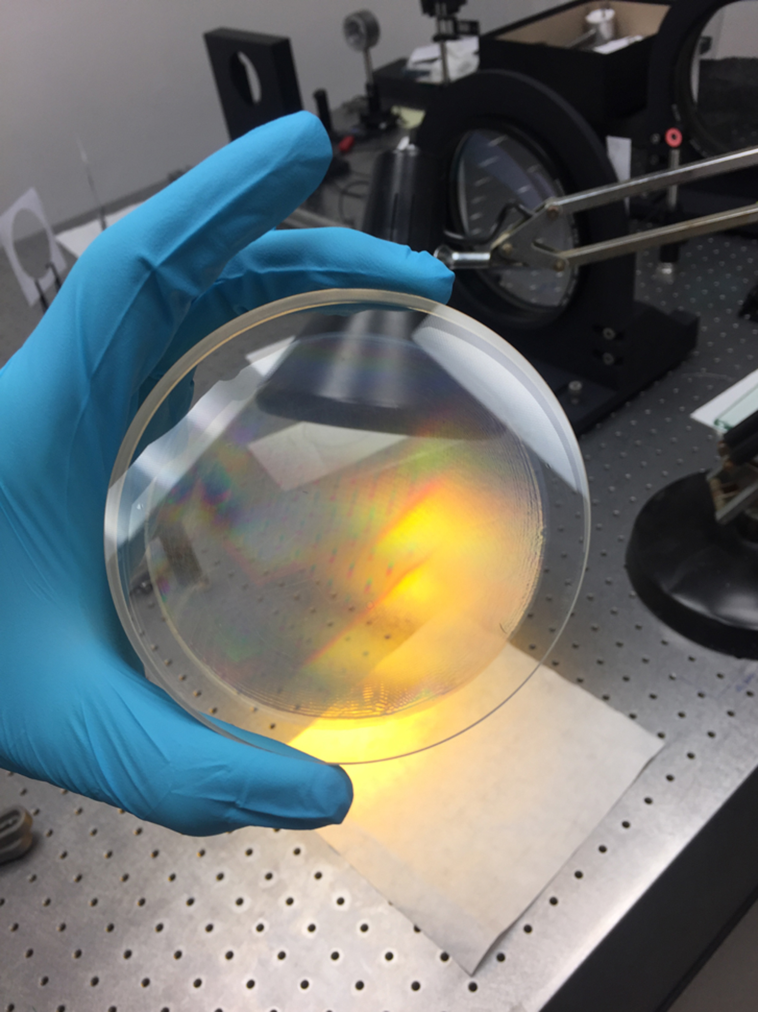 ????????意大利國家天體物理學(xué)研究所(INAF)正在研究基于體積全息圖的全息光學(xué)元件,該全息光學(xué)元件可以非常有效地將恒星發(fā)出的光分解為不同顏色,以便進(jìn)行光譜研究。在與材料制造商科思創(chuàng)的多年合作中,其量身定制的Bayfol?HX光敏聚合物膜被證明是能幫助高性能望遠(yuǎn)鏡穩(wěn)定重復(fù)地作出高效體積全息圖的理想選擇,適用于每種截然不同的新穎光譜儀。這樣就可以使用適當(dāng)?shù)募す馄毓庠O(shè)置下,將周期性折射率圖案靈活地刻入Bayfol?HX薄膜的體積中。如此,星光就可以被非常有效地衍射。與現(xiàn)有的棱鏡相比,Bayfol?HX薄膜能將星光更有效地分離成其光譜分量。