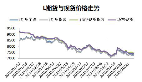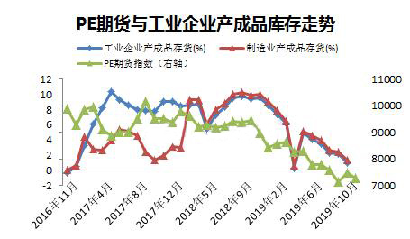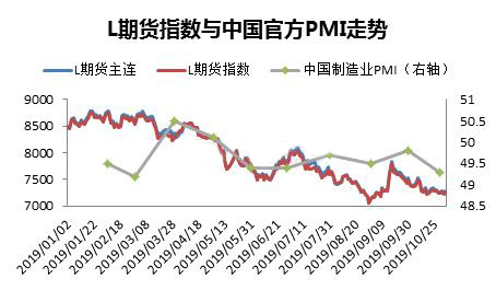 ????????2019年月初以來價格數(shù)據(jù)顯示,PE期貨和現(xiàn)貨相關(guān)度極高,幾乎同步漲跌,因此以下的分析,取期貨價格指數(shù)跟宏觀指標對比。