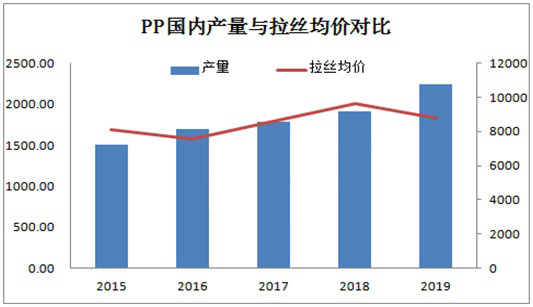 ????????國(guó)內(nèi)PP產(chǎn)量與拉絲均價(jià)呈現(xiàn)較為明顯反比趨勢(shì),2016、及2018-2019年表現(xiàn)尤為明顯。2016年國(guó)內(nèi)PP產(chǎn)量經(jīng)歷了2014-2015年繼續(xù)擴(kuò)張后,年產(chǎn)量高達(dá)1695.69萬(wàn)噸,當(dāng)年國(guó)內(nèi)拉絲均價(jià)由2015年8090元/噸降至7570元/噸,降幅6.43%。2018年是近幾年產(chǎn)能增速相對(duì)較慢的一年,受整體擴(kuò)能放緩且國(guó)內(nèi)大型企業(yè)檢修集中支撐,國(guó)內(nèi)拉絲均聚同比2017年漲幅12.7%。2019年1-10月份整體擴(kuò)能202萬(wàn)噸,均價(jià)同比2018年跌幅8.35%。