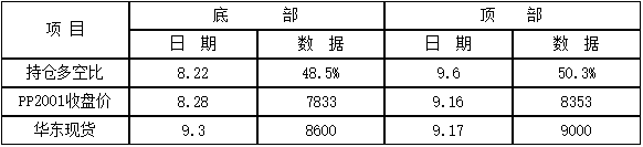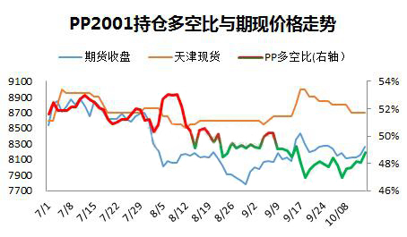 ????????第二、7月以來(lái)多空比曲線下行過程中,PP期現(xiàn)價(jià)格并不同步,多空比形成階段性底部和頂部相對(duì)領(lǐng)先,在50%臨界線之下,多單逐步增加,多空比逐步提升,此時(shí)配合基本面情況,有擇機(jī)介入短多的機(jī)會(huì)。多空比在8月22日達(dá)到階段性底部48.5%,之后開始一波反彈,多空比的底部領(lǐng)先期現(xiàn)價(jià)格一周左右時(shí)間,8月28日PP2001收盤7833元/噸,華東現(xiàn)貨在9月3日8600元/噸,相繼形成底部;9月6日,持倉(cāng)多空比50.3%形成階段性頂部,且50%臨界線之上僅僅維持兩天就再次轉(zhuǎn)頭下行,此次多空比領(lǐng)先了期現(xiàn)價(jià)格10天左右??傊?dāng)多空比、期貨和現(xiàn)貨價(jià)格同向而行,“共振”之際,方可順勢(shì)而為。