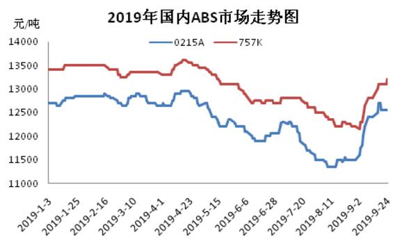 ????????2019年三季度,國內(nèi)ABS市場呈現(xiàn)出先抑后揚(yáng)的態(tài)勢,以余姚市場吉化0215A為例,價(jià)格運(yùn)行區(qū)間在11350-12700元/噸。