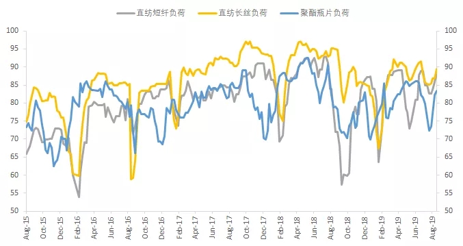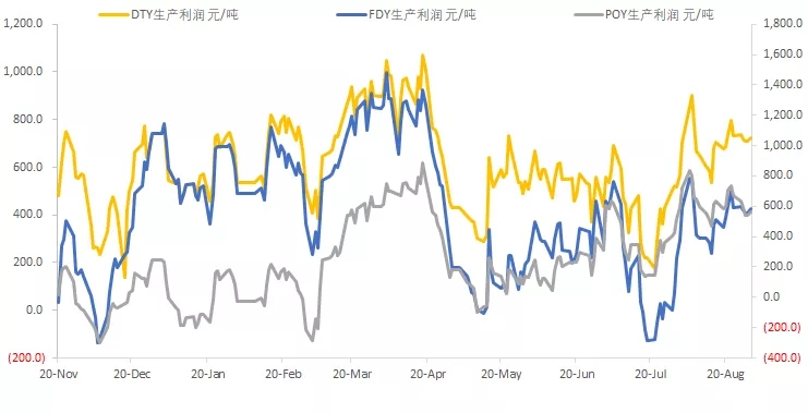 ????????最近聚酯產(chǎn)業(yè)鏈下游利潤和開工率齊升,說明終端對聚酯的需求還不錯,上游讓渡的利潤也盤活了下游企業(yè)。長絲的產(chǎn)銷最近也有所回升,8月份平均產(chǎn)銷率為83%,基本上與去年同期持平,反觀7月份的平均產(chǎn)銷率只有55%,8月份下游真的是有很大起色,但是上游PTA毫無起色。