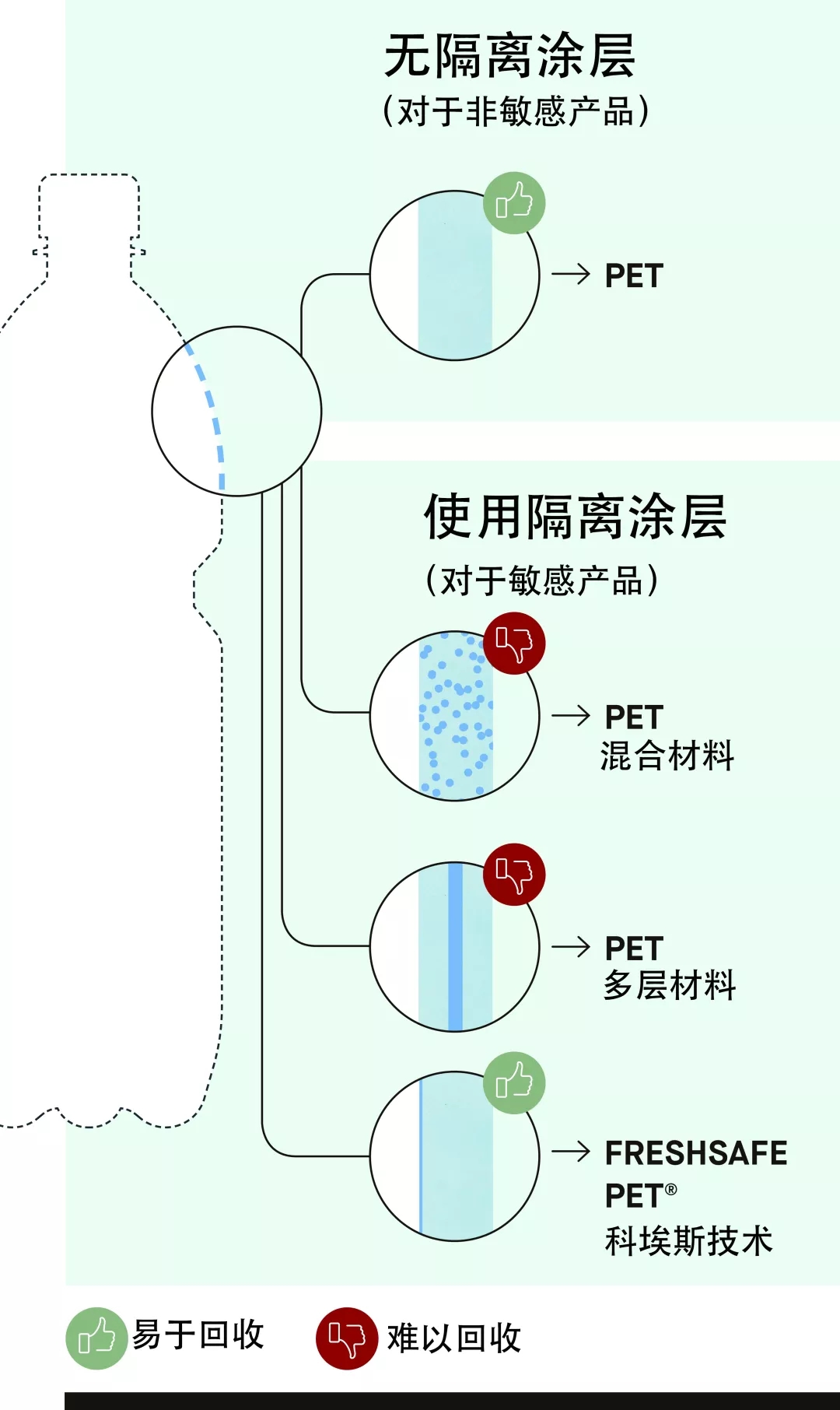 ????????新法規(guī)也會(huì)對(duì)使用不可回收PET瓶灌裝果汁和飲料的生產(chǎn)商產(chǎn)生影響,其投放市場(chǎng)的產(chǎn)品無法不參與押金回收系統(tǒng)。飲料包裝能夠阻隔飲料產(chǎn)品受到外部環(huán)境的影響,如與氧氣的接觸等。因此,許多果汁和甘露飲料使用由不可分解的多層或混合材料制成的PET瓶灌裝,以此吸收氧氣進(jìn)行阻隔。這些添加的材料使得瓶比普通 PET 塑料瓶更不易于回收,因?yàn)榻?jīng)過精心加工的各種材料不能分離,還會(huì)導(dǎo)致回收物變色。不可回收的 PET 容器會(huì)使全球范圍的回收問題變得愈加嚴(yán)重,并使得從瓶到瓶的rPET回收幾乎不可能實(shí)現(xiàn)。