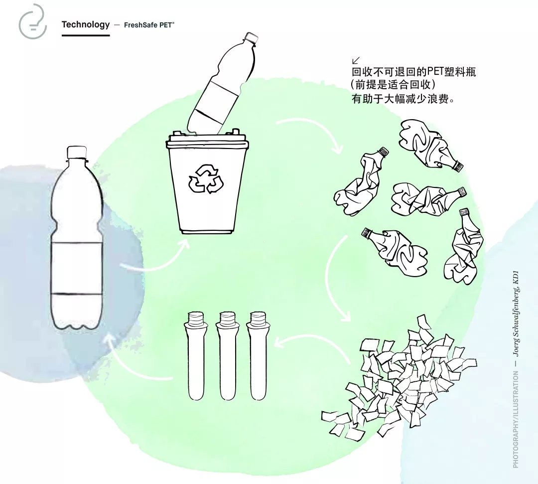 ????????“玻璃涂覆的PET塑料瓶使得果汁和甘露飲料瓶能夠與其他用過的PET塑料瓶(如礦泉水瓶或碳酸飲料瓶)一起被回收和利用?!?/p>