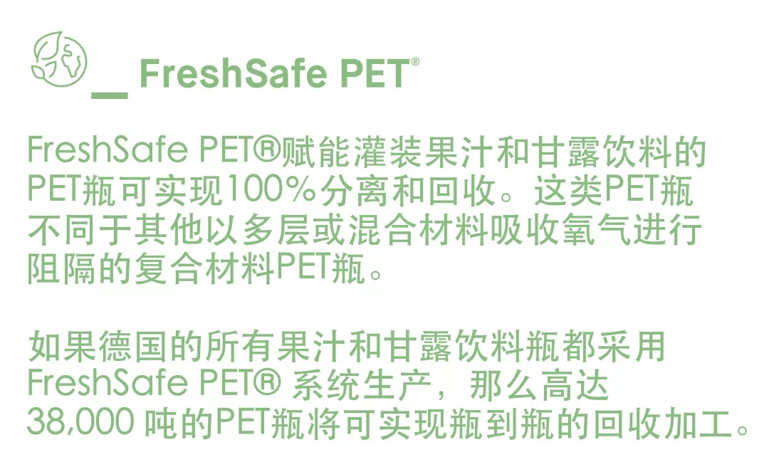 ????????新德國(guó)包裝法對(duì)果汁和花蜜瓶的解決方案:KHS科埃斯FreshSafe PET?技術(shù)將產(chǎn)品保護(hù)與瓶到瓶的可回收性結(jié)合在一起。