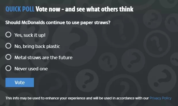 ????????當(dāng)時(shí)麥當(dāng)勞英國(guó)首席執(zhí)行官Paul Pomroy在接受Sky News的采訪時(shí)說(shuō)“現(xiàn)在麥當(dāng)勞使用的塑料吸管其實(shí)是可回收的。但是還是有很多消費(fèi)者向他們表示不滿,覺(jué)得用塑料吸管總體來(lái)說(shuō)還是對(duì)環(huán)境不好。”