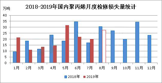????????2019年8月份,國內(nèi)聚丙烯檢修損失量預(yù)計在27.63萬噸,環(huán)比(2019年7月份20.12萬噸)增加7.51萬噸,增幅在37.33%;同比(2018年8月30.66萬噸)減少3.03萬噸,減少9.9%。2019年1-8月份,預(yù)計累積檢修損失量為162.15萬噸,較去年同期(2018年1-8月164.11萬噸)略有減少,降幅1.2%。