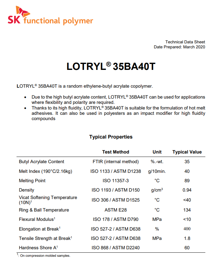 - EBA 法國阿科瑪 35BA40T 物性表, EBA 法國阿科瑪 35BA40T 產(chǎn)品參數(shù),EBA 法國阿科瑪 35BA40T 性能表,EBA 法國阿科瑪 35BA40T 出廠報告, MSDS,, 物質(zhì)安全資料表, UL黃卡,{ SGS報告, RoHS, 食品級認證, NSF飲用水標準, 產(chǎn)品資料, 產(chǎn)品性能, 出廠報告, 原廠原包, 代理商, 熱變形溫度, 熔指數(shù), 流動系數(shù), 抗沖擊性能、沖擊強度, 低溫韌性、低溫抗沖擊性能, 熔體流動系數(shù)、熔體流動速率, 加工工藝、加工參數(shù)、加工溫度, 歐盟RoHS 德國FDA 美國FDA 日本FDA