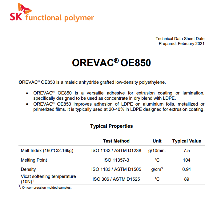 • 阿科瑪Orevac® OE850粘結樹脂粘結樹脂 物性表, 阿科瑪Orevac® OE850粘結樹脂粘結樹脂 產品參數,阿科瑪Orevac® OE850粘結樹脂粘結樹脂 性能表,阿科瑪Orevac® OE850粘結樹脂粘結樹脂 出廠報告, MSDS,, 物質安全資料表, UL黃卡,{ SGS報告, RoHS, 食品級認證, NSF飲用水標準, 產品資料, 產品性能, 出廠報告, 原廠原包, 代理商, 熱變形溫度, 熔指數, 流動系數, 抗沖擊性能、沖擊強度, 低溫韌性、低溫抗沖擊性能, 熔體流動系數、熔體流動速率, 加工工藝、加工參數、加工溫度, 歐盟RoHS 德國FDA 美國FDA 日本FDA