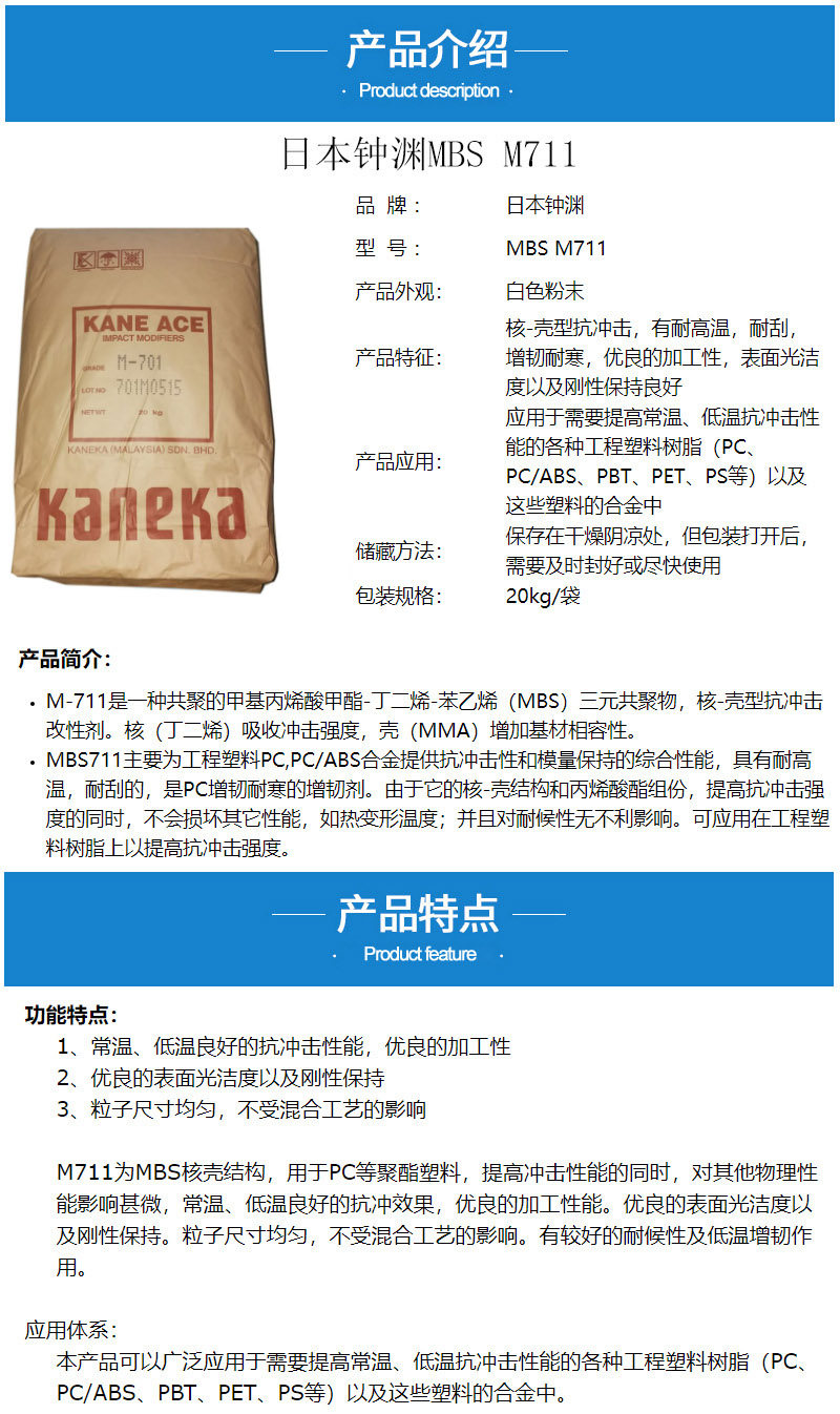 - MBS日本鐘淵M711 耐寒耐候增韌劑 PC抗沖擊改性劑 鐘淵mbs711 物性表, MBS日本鐘淵M711 耐寒耐候增韌劑 PC抗沖擊改性劑 鐘淵mbs711 產(chǎn)品參數(shù),MBS日本鐘淵M711 耐寒耐候增韌劑 PC抗沖擊改性劑 鐘淵mbs711 性能表,MBS日本鐘淵M711 耐寒耐候增韌劑 PC抗沖擊改性劑 鐘淵mbs711 出廠報(bào)告, MSDS,, 物質(zhì)安全資料表, UL黃卡,{ SGS報(bào)告, RoHS, 食品級認(rèn)證, NSF飲用水標(biāo)準(zhǔn), 產(chǎn)品資料, 產(chǎn)品性能, 出廠報(bào)告, 原廠原包, 代理商, 熱變形溫度, 熔指數(shù), 流動(dòng)系數(shù), 抗沖擊性能、沖擊強(qiáng)度, 低溫韌性、低溫抗沖擊性能, 熔體流動(dòng)系數(shù)、熔體流動(dòng)速率, 加工工藝、加工參數(shù)、加工溫度, 歐盟RoHS 德國FDA 美國FDA 日本FDA