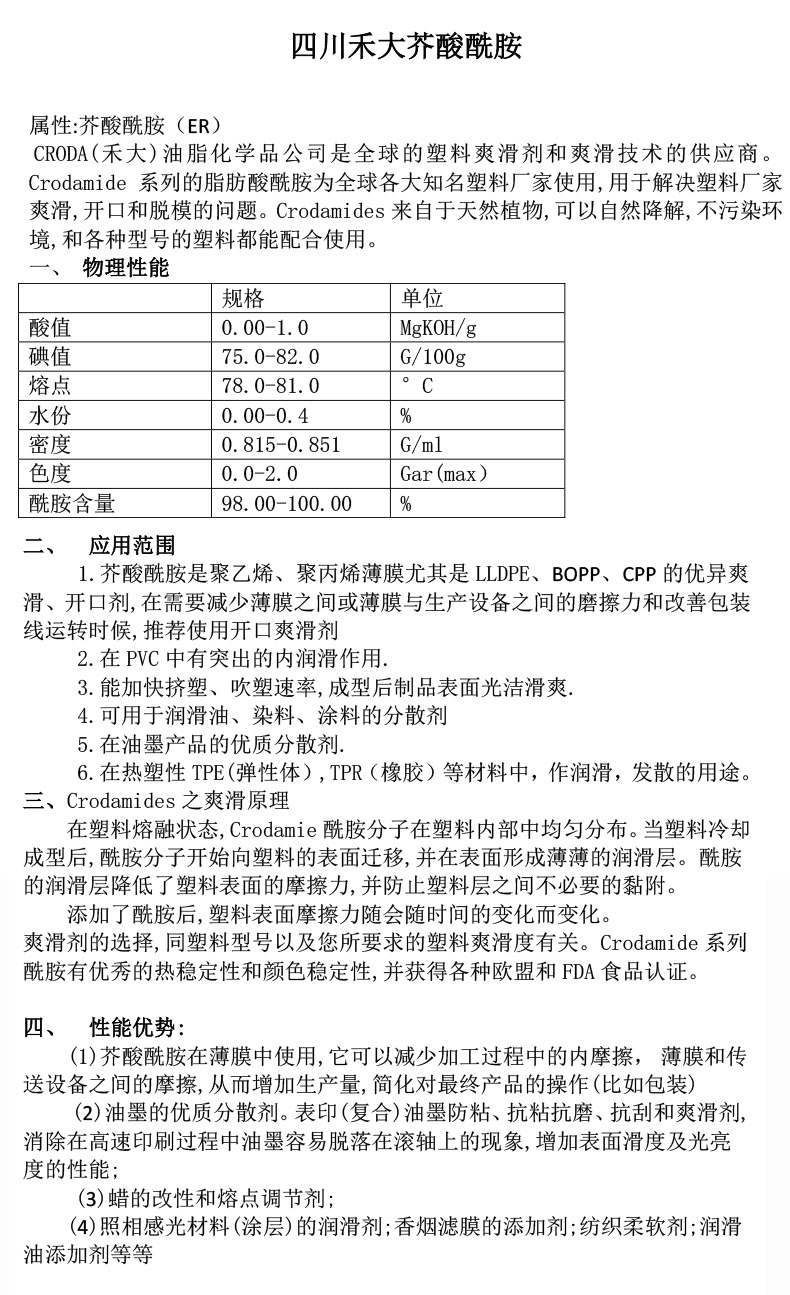 - 禾大CRODA芥酸酰胺 ER-CH-BE 物性表, 禾大CRODA芥酸酰胺 ER-CH-BE 產(chǎn)品參數(shù),禾大CRODA芥酸酰胺 ER-CH-BE 性能表,禾大CRODA芥酸酰胺 ER-CH-BE 出廠報告, MSDS,, 物質(zhì)安全資料表, UL黃卡,{ SGS報告, RoHS, 食品級認(rèn)證, NSF飲用水標(biāo)準(zhǔn), 產(chǎn)品資料, 產(chǎn)品性能, 出廠報告, 原廠原包, 代理商, 熱變形溫度, 熔指數(shù), 流動系數(shù), 抗沖擊性能、沖擊強度, 低溫韌性、低溫抗沖擊性能, 熔體流動系數(shù)、熔體流動速率, 加工工藝、加工參數(shù)、加工溫度, 歐盟RoHS 德國FDA 美國FDA 日本FDA