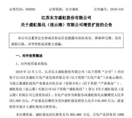 截止2019年3月31日,石化產(chǎn)業(yè)未經(jīng)審計(jì)單體財(cái)務(wù)報(bào)表的資產(chǎn)總額12.80億元,負(fù)債總額2.8億元,凈資產(chǎn)10億元,2019年1-3月營(yíng)業(yè)收入0萬元,凈利潤(rùn)1.26萬元。 東方盛虹稱,本次對(duì)石化產(chǎn)業(yè)增資,主要是為了通過石化產(chǎn)業(yè)收購江蘇虹港石化有限公司股權(quán),以及對(duì)盛虹煉化(連云港)有限公司增資,加快實(shí)施“原油煉化-PX/乙二醇-PTA-聚酯-化纖”新型高端紡織產(chǎn)業(yè)鏈的長(zhǎng)遠(yuǎn)發(fā)展規(guī)劃和發(fā)展戰(zhàn)略。 此外,東方盛虹同日公告稱,公司擬通過石化產(chǎn)業(yè)對(duì)盛虹煉化(連云港)有限公司(以下簡(jiǎn)稱“盛虹煉化”)以貨幣方式增資70億元。本次增資完成后,盛虹煉化的注冊(cè)資本將從10億元增加至80億元。
