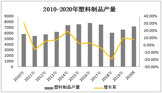 由2010-2020年塑料制品產(chǎn)量數(shù)據(jù)分析發(fā)現(xiàn),國內(nèi)塑料制品增速呈現(xiàn)逐步放緩趨勢(shì),尤其在經(jīng)歷了2014年高位之后,塑料制品整體增速呈現(xiàn)震蕩下滑趨勢(shì)。分析塑料制品快速下滑主要原因是國內(nèi)環(huán)保嚴(yán)查,同時(shí)在中美貿(mào)易戰(zhàn)影響下,代加工企業(yè)減少所致。2019年后塑料制品增速再度放緩,主因全球經(jīng)濟(jì)增長乏力,國內(nèi)經(jīng)濟(jì)環(huán)境影響下游制品企業(yè)訂單跟進(jìn)不足,導(dǎo)致塑料產(chǎn)品整體產(chǎn)量相對(duì)減少。