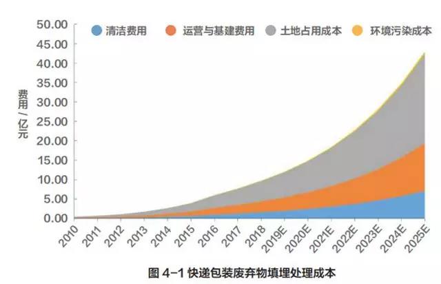 用此方法估算,平均每噸快遞垃圾填埋所需的處理費用為 705 元,其中填埋場占用土地產(chǎn)生的成本較大。以2018 年為例,填埋 138.13 萬噸快遞垃圾需垃圾處理費用 9.74 億元,其中土地占用成本 5.22 億元、運營與基建費用 2.79 億元、清運費用 1.61 億元,環(huán)境污染成本 1265 萬元。若不采取有效的措施,至 2025 年我國填埋快遞包裝將達到 608.71 萬噸,處理費用達 42.92 億元;