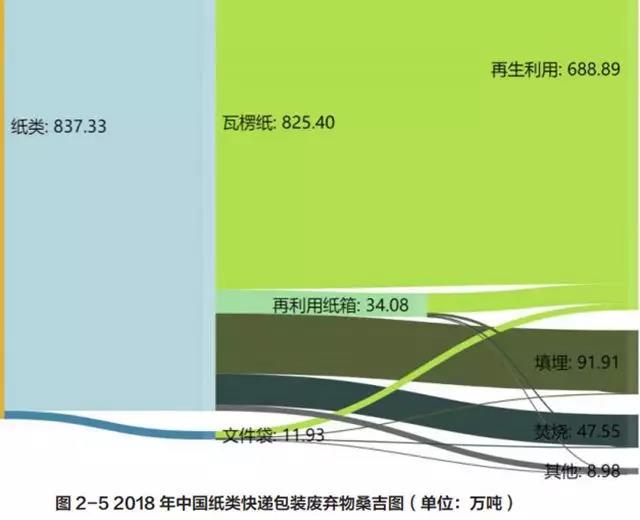調(diào)查發(fā)現(xiàn)快遞紙箱類包裝廢棄物只有不到 5% 被重復使用,按重量計算約有 80% 的紙箱被回收,還有約 15% 混入生活垃圾。以 2018 年為例,我國快遞行業(yè)共消耗紙類包裝材料 837.33 萬噸(不包括快遞單號紙),其中文件袋用紙 11.93 萬噸,瓦楞紙箱、紙筒和膠帶芯等瓦楞紙消耗量 825.40 萬噸。這其中僅有約 34.08 萬噸的瓦楞紙箱被重復使用,通過流動回收業(yè)者回收的約有 688.89 萬噸快遞包裝廢紙(瓦楞紙 679.43 萬噸,文件袋 9.46 萬噸)。計算得到快遞紙類包裝產(chǎn)生量和流量信息如圖 2-5 所示: