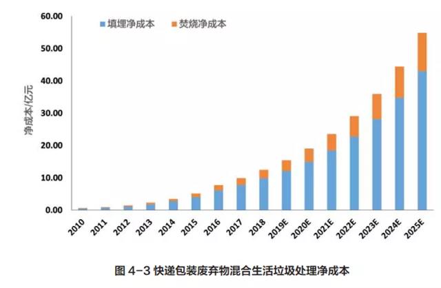 平均焚燒 1 噸快遞垃圾所需費用 511 元,根據(jù)住建部發(fā)布的《中國城市建設(shè)統(tǒng)計年鑒》,2016 年我國生活垃圾填埋比例高達 60%,而焚燒比例為 38%,依此比例推算,2018 年快遞包裝焚燒量為 81.27 萬噸,處理費用也增至 4.15 億元。雖然生活垃圾焚燒發(fā)電產(chǎn)生了部分經(jīng)濟效益,但效益遠低于成本。2018 年垃圾焚燒效益雖達到 1.46 億元,但凈成本也增長到了 2.69 億。