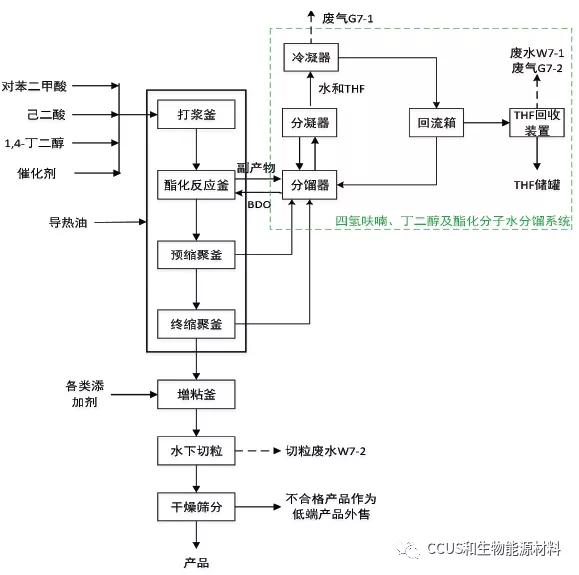 合成PBAT 采用的方法為直接酯化法,主要是以苯二甲酸(PTA)、己二酸(AA)與丁二醇(BDO)為原料,在催化劑的作用下直接進(jìn)行酯化、縮聚反應(yīng)而制得。該方法優(yōu)點(diǎn)是工藝流程短、原料利用率高、反應(yīng)時(shí)間短、生產(chǎn)效率高;缺點(diǎn)是反應(yīng)體系物質(zhì)較復(fù)雜、相對(duì)分子質(zhì)量分布寬、反應(yīng)介質(zhì)酸性較強(qiáng)。PBAT 生產(chǎn)過程中,酯化及縮聚轉(zhuǎn)化率約為99%。反應(yīng)過程中,有副反應(yīng)發(fā)生:過剩的1,4-丁二醇脫水生成四氫呋喃。