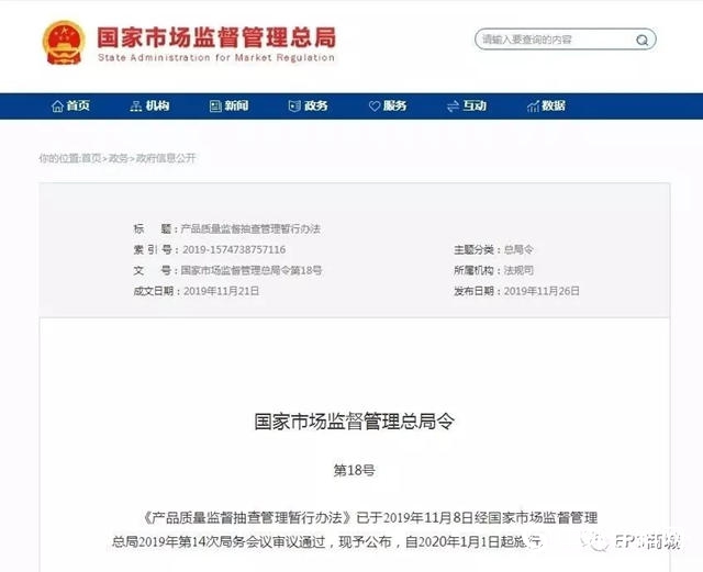 11月26日,國家市場監(jiān)督管理總局發(fā)布《產(chǎn)品質(zhì)量監(jiān)督抽查管理暫行辦法》,將自2020年1月1日起施行?!掇k法》共56條,明確了監(jiān)督抽查的組織、抽樣、檢驗、異議處理、結(jié)果處理及相關(guān)人員應承擔的法律責任,對于加強產(chǎn)品質(zhì)量監(jiān)督管理、規(guī)范產(chǎn)品質(zhì)量監(jiān)督抽查工作、保護消費者的合法權(quán)益有重要意義。