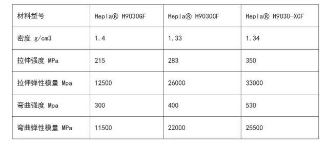 該產品具有優(yōu)異的機械強度與抗沖擊能力,尺寸穩(wěn)定性高、翹曲低,材料性能較進口產品提升30%。以高溫尼龍為基材的Hepla? H9000-XCF系列碳纖維復合材料,彎曲剛度超過52GPa,彎曲強度高達520MPa,拉伸強度達到360MPa;以PA66為基材的Hepla? H7200-XCF系列拉伸強度達到315MPa。 采用新產品生產的零部件比鋼制零部件輕75%,比鋁合金部件輕40%,可替代大部分金屬,從而為汽車輕量化及其它行業(yè)“以塑代鋼”提供更好的解決方案。