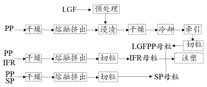 ????????將PP,ODOPE,Sb2O3,EG按一定的比例加入到高速混合機(jī)中,均勻混合后加入到雙螺桿擠出機(jī)中(溫度250℃,螺桿轉(zhuǎn)速300r/min),經(jīng)過熔融共混,熔體進(jìn)入LGF浸漬模具(溫度設(shè)定260℃),LGF經(jīng)過分散、充分浸漬,經(jīng)口模牽引拉出、水冷、風(fēng)干、造粒,得到阻燃LGFPP顆粒, 然后注塑成試樣。