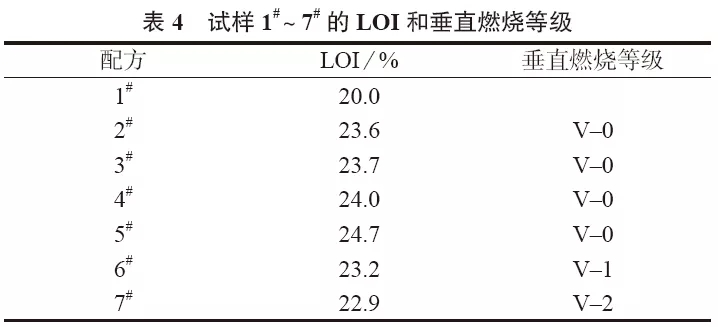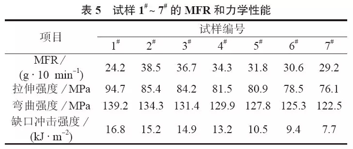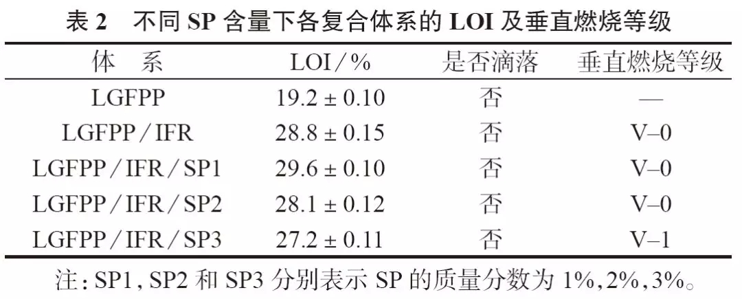 ????????加入IFR后復(fù)合體系的力學(xué)性能有所下降,再加入SP后力學(xué)性能進(jìn)一步下降。SP質(zhì)量分?jǐn)?shù)為1%的體系力學(xué)性能相對(duì)較高,其拉伸、彎曲強(qiáng)度和缺口沖擊強(qiáng)度相對(duì)于LGFPP/IFR阻燃復(fù)合體系分別下降了20.46%,12.06%和10.65%,下降幅度相對(duì)較小。?