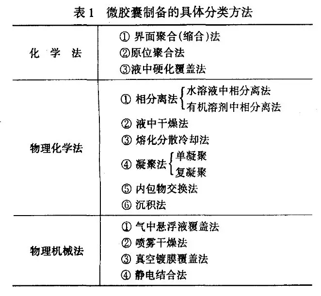 ????????微膠囊的制備方法有很多種,通常分為化學(xué)法、物理化學(xué)法和物理機(jī)械法三種,表1中列出了常見的制備方法。