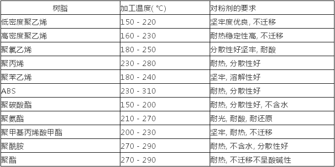 ????????著色劑與樹脂兩者不應(yīng)發(fā)生化學(xué)反應(yīng), 不應(yīng)促進(jìn)樹脂分解。對于高活性樹脂如聚酰胺樹脂( PA) ,其熔融狀態(tài)顯示還原性, 容易使著色劑改變顏色,因此, 只有少數(shù)著色劑可供選擇。