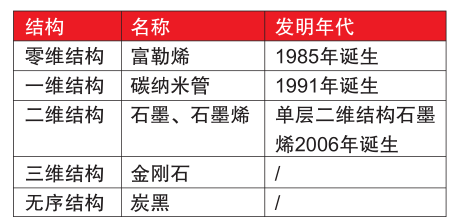 ????????石墨烯為碳的一種新的同素異構(gòu)體,截止到目前已開(kāi)發(fā)的各類碳材料的不同同素異構(gòu)體如表1所示。