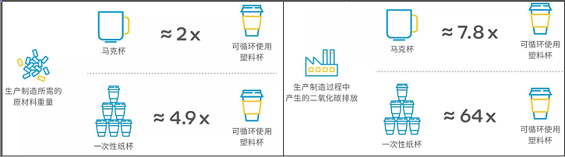 研究數(shù)據(jù)顯示:以一個(gè)普通大小的杯子為例,可循環(huán)使用的塑料杯對(duì)比馬克杯和一次性紙杯,無(wú)論在生產(chǎn)過(guò)程中的原材料損耗還是二氧化碳排放都占據(jù)優(yōu)勢(shì)。