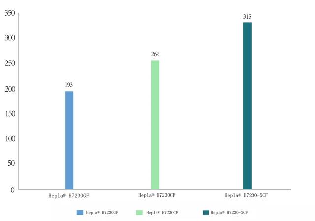 下圖為Hepla? H7230-XCF(30%碳纖維)與Hepla? H7230CF (30%碳纖維)、Hepla? H7230GF(30%玻璃纖維)的拉伸強度對照圖。