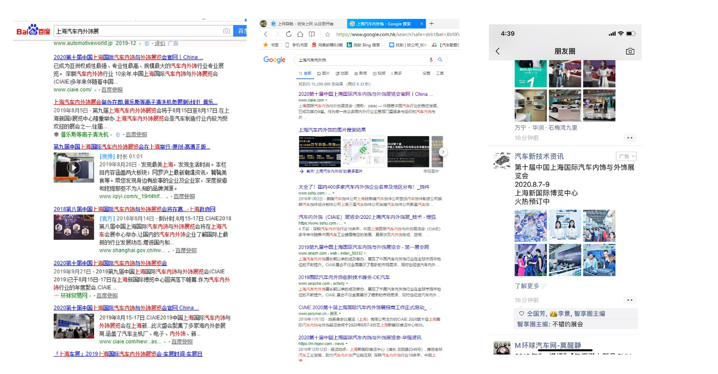 ????????百度搜索引擎和谷歌搜索引擎是全球使用量最多的搜索引擎,通過百度、谷歌營銷投放搜索廣告以及網(wǎng)站關(guān)鍵詞快排,全面覆蓋汽車工業(yè)行業(yè),每天處理數(shù)10億次搜索請求,讓億萬有需求的行業(yè)專業(yè)人士看到我們的展會信息。
