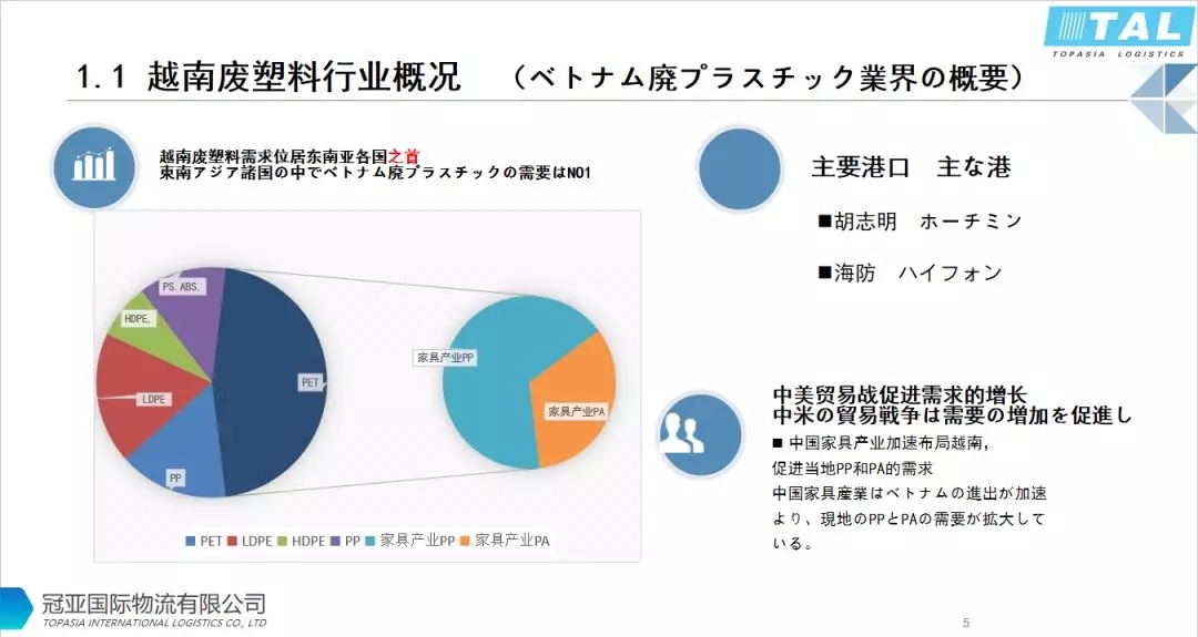 ????????越南廢塑料需求位居?xùn)|南亞各國之首,再生塑料在越南的市場有PET,PP,PE,PS,ABS,PA。主要進(jìn)口港口:海防,胡志明。