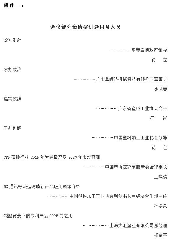 ????????為了交流行業(yè)信息,推廣新技術(shù)、新設(shè)備、新材料,鼓勵技術(shù)創(chuàng)新,促進(jìn)行業(yè)發(fā)展,中國塑協(xié)流延薄膜專業(yè)委員會(簡稱流延薄膜專委會)將于2019年12月26日-27日在廣東東莞召開“2019流延薄膜行業(yè)市場與技術(shù)發(fā)展高峰論壇暨流延薄膜專委會換屆大會、流延聚乙烯纏繞膜、牧草膜行業(yè)誠信與創(chuàng)新發(fā)展聯(lián)盟成立大會暨《流延聚乙烯纏繞膜》團(tuán)體標(biāo)準(zhǔn)第一次工作會議”。