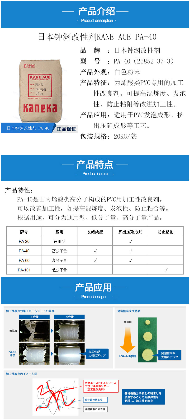 - 日本鐘淵KANE ACE PA-40增韌劑 PVC發(fā)泡混煉改進劑 鐘淵mbs PA40 物性表, 日本鐘淵KANE ACE PA-40增韌劑 PVC發(fā)泡混煉改進劑 鐘淵mbs PA40 產(chǎn)品參數(shù),日本鐘淵KANE ACE PA-40增韌劑 PVC發(fā)泡混煉改進劑 鐘淵mbs PA40 性能表,日本鐘淵KANE ACE PA-40增韌劑 PVC發(fā)泡混煉改進劑 鐘淵mbs PA40 出廠報告, MSDS,, 物質(zhì)安全資料表, UL黃卡,{ SGS報告, RoHS, 食品級認證, NSF飲用水標準, 產(chǎn)品資料, 產(chǎn)品性能, 出廠報告, 原廠原包, 代理商, 熱變形溫度, 熔指數(shù), 流動系數(shù), 抗沖擊性能、沖擊強度, 低溫韌性、低溫抗沖擊性能, 熔體流動系數(shù)、熔體流動速率, 加工工藝、加工參數(shù)、加工溫度, 歐盟RoHS 德國FDA 美國FDA 日本FDA