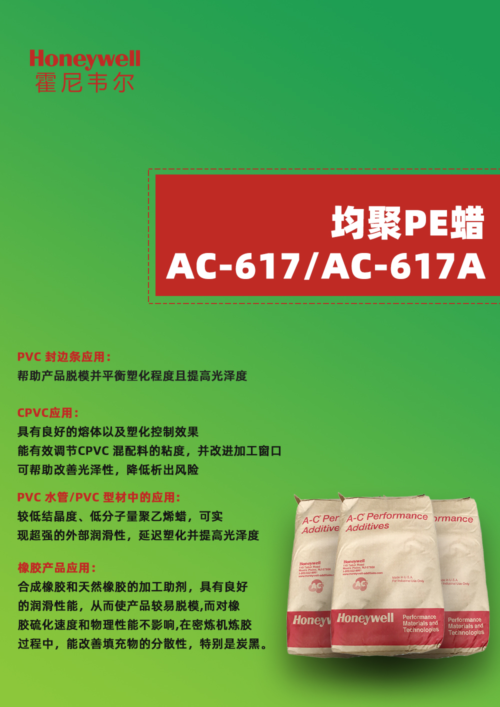 • 霍尼韋爾 橡膠助劑 AC-617 橡膠分散劑低分子聚乙烯蠟 物性表, 霍尼韋爾 橡膠助劑 AC-617 橡膠分散劑低分子聚乙烯蠟 產品參數(shù),霍尼韋爾 橡膠助劑 AC-617 橡膠分散劑低分子聚乙烯蠟 性能表,霍尼韋爾 橡膠助劑 AC-617 橡膠分散劑低分子聚乙烯蠟 出廠報告, MSDS,, 物質安全資料表, UL黃卡,{ SGS報告, RoHS, 食品級認證, NSF飲用水標準, 產品資料, 產品性能, 出廠報告, 原廠原包, 代理商, 熱變形溫度, 熔指數(shù), 流動系數(shù), 抗沖擊性能、沖擊強度, 低溫韌性、低溫抗沖擊性能, 熔體流動系數(shù)、熔體流動速率, 加工工藝、加工參數(shù)、加工溫度, 歐盟RoHS 德國FDA 美國FDA 日本FDA