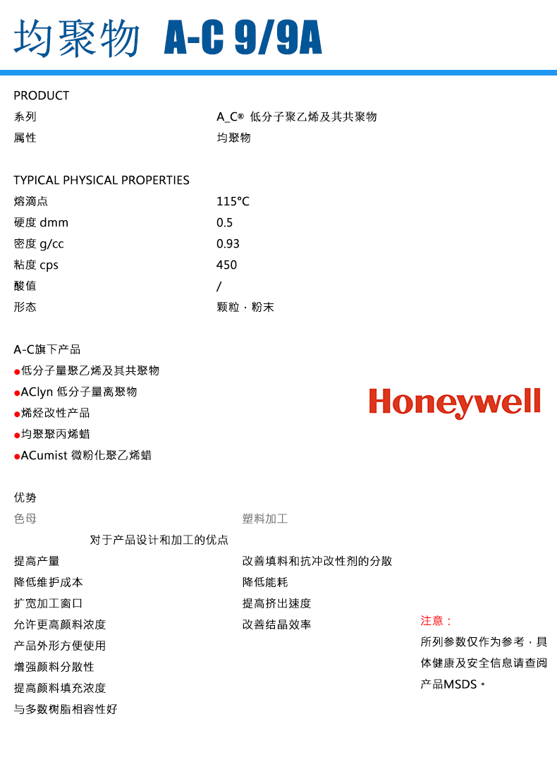 • 霍尼韋爾 A-C® 9A 低密度聚乙烯 (LDPE) 均聚物 物性表, 霍尼韋爾 A-C® 9A 低密度聚乙烯 (LDPE) 均聚物 產(chǎn)品參數(shù),霍尼韋爾 A-C® 9A 低密度聚乙烯 (LDPE) 均聚物 性能表,霍尼韋爾 A-C® 9A 低密度聚乙烯 (LDPE) 均聚物 出廠報告, MSDS,, 物質(zhì)安全資料表, UL黃卡,{ SGS報告, RoHS, 食品級認證, NSF飲用水標準, 產(chǎn)品資料, 產(chǎn)品性能, 出廠報告, 原廠原包, 代理商, 熱變形溫度, 熔指數(shù), 流動系數(shù), 抗沖擊性能、沖擊強度, 低溫韌性、低溫抗沖擊性能, 熔體流動系數(shù)、熔體流動速率, 加工工藝、加工參數(shù)、加工溫度, 歐盟RoHS 德國FDA 美國FDA 日本FDA