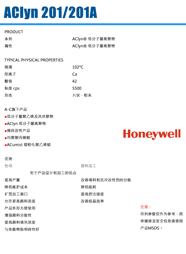 - 霍尼韋爾 AClyn® 201A EAA共聚物的鈣離子聚合物 物性表, 霍尼韋爾 AClyn® 201A EAA共聚物的鈣離子聚合物 產(chǎn)品參數(shù),霍尼韋爾 AClyn® 201A EAA共聚物的鈣離子聚合物 性能表,霍尼韋爾 AClyn® 201A EAA共聚物的鈣離子聚合物 出廠報(bào)告, MSDS,, 物質(zhì)安全資料表, UL黃卡,{ SGS報(bào)告, RoHS, 食品級(jí)認(rèn)證, NSF飲用水標(biāo)準(zhǔn), 產(chǎn)品資料, 產(chǎn)品性能, 出廠報(bào)告, 原廠原包, 代理商, 熱變形溫度, 熔指數(shù), 流動(dòng)系數(shù), 抗沖擊性能、沖擊強(qiáng)度, 低溫韌性、低溫抗沖擊性能, 熔體流動(dòng)系數(shù)、熔體流動(dòng)速率, 加工工藝、加工參數(shù)、加工溫度, 歐盟RoHS 德國FDA 美國FDA 日本FDA