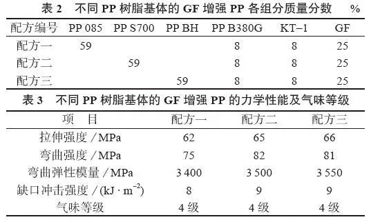 ????????可以看出,無論P(yáng)P基體是粉料還是粒料,不同配方材料的氣味等級均為4 級。由此推測在GF增強(qiáng)PP體系中,氣味的最根本來源在于相容劑PP-g-MAH。
