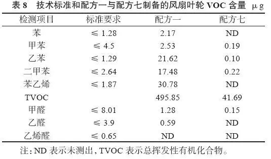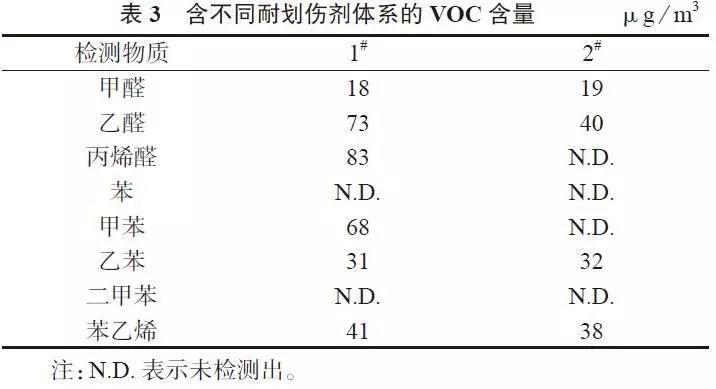 ????????1# 和2# 所散發(fā)的總揮發(fā)性有機(jī)化合物(TVOC) 含量分別為18.47 μgC/g和14.16 μgC/g,兩個體系的TVOC含量均滿足要求( 低于50 μgC/g)。但從表中可以看出,2#在氣味等級和VOC方面總體上均低于1#。
