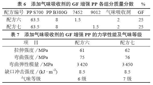 ????????添加氣味吸收劑之后,材料的力學(xué)性能有所下降,但下降幅度較小,而氣味等級均比原來提高一個等級。