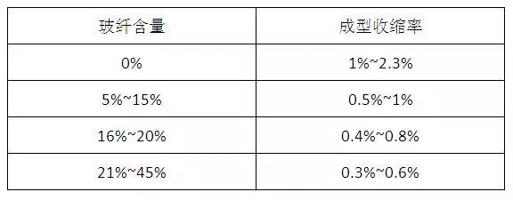 ????????玻纖加入量越多,尼龍的成型收縮率越小。但是玻纖加入量過多會造成表面浮纖、相容性差等后果,玻纖含量一般在30%左右時效果相對較好。下表是一份由經(jīng)驗得到的“玻纖含量-成型收縮率”表。