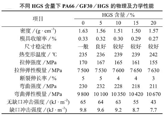 ????????采用HGS填充玻纖增強(qiáng)阻燃PA66,可以實(shí)現(xiàn)減重目的,同時(shí)改善材料的吸水性、尺寸穩(wěn)定性及耐熱性。采用平均粒徑20?μm的HGS粒徑越小,當(dāng)HGS含量在5%~10%時(shí),PA66/GF30/HGS的綜合性能較好。