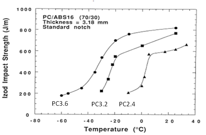 ????????由圖可見(jiàn),PC分子量越高,其對(duì)應(yīng)PC/ABS的缺口沖擊強(qiáng)度越高,發(fā)生脆韌轉(zhuǎn)變的溫度越低。PC分子量較低的時(shí)候,其對(duì)應(yīng)PC/ABS沖擊強(qiáng)度隨溫度降低而下降的速度很快。如常溫(25℃)時(shí), PC3.6、PC3.2和PC2.4對(duì)應(yīng)的PC/ABS的缺口沖擊強(qiáng)度分別為800J/m、750J/m和600J/m,而在-10℃時(shí),其對(duì)應(yīng)值分別為750J/m、600J/m和200J/m,PC2.4/ABS沖擊下降明顯。因此,要制作高沖擊強(qiáng)度的PC/ABS,特別是對(duì)低溫沖擊有要求時(shí),一方面是盡量選擇分子量較高的PC原料,另一方面是盡量減少PC/ABS加工過(guò)程中的降解,防止PC分子量下降。